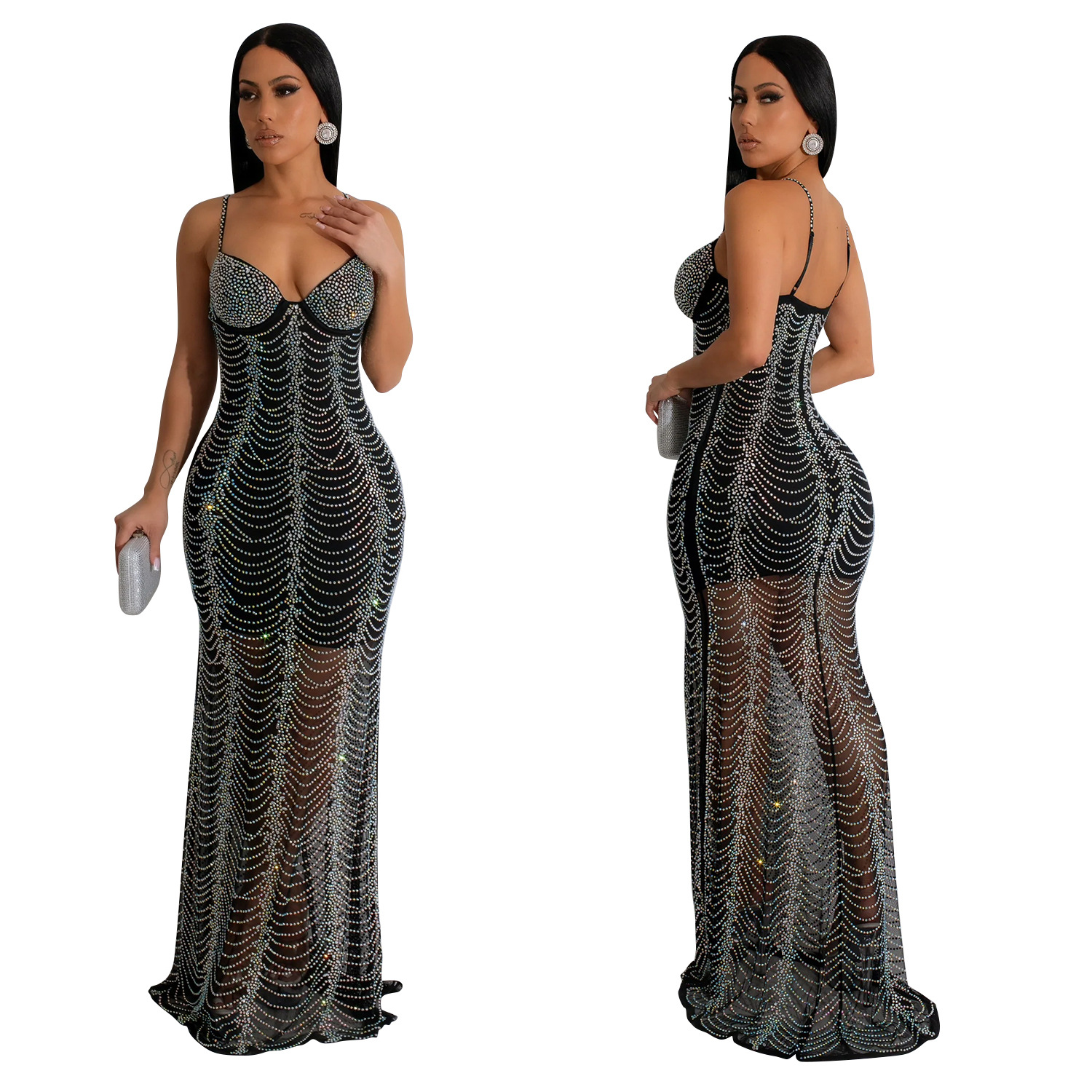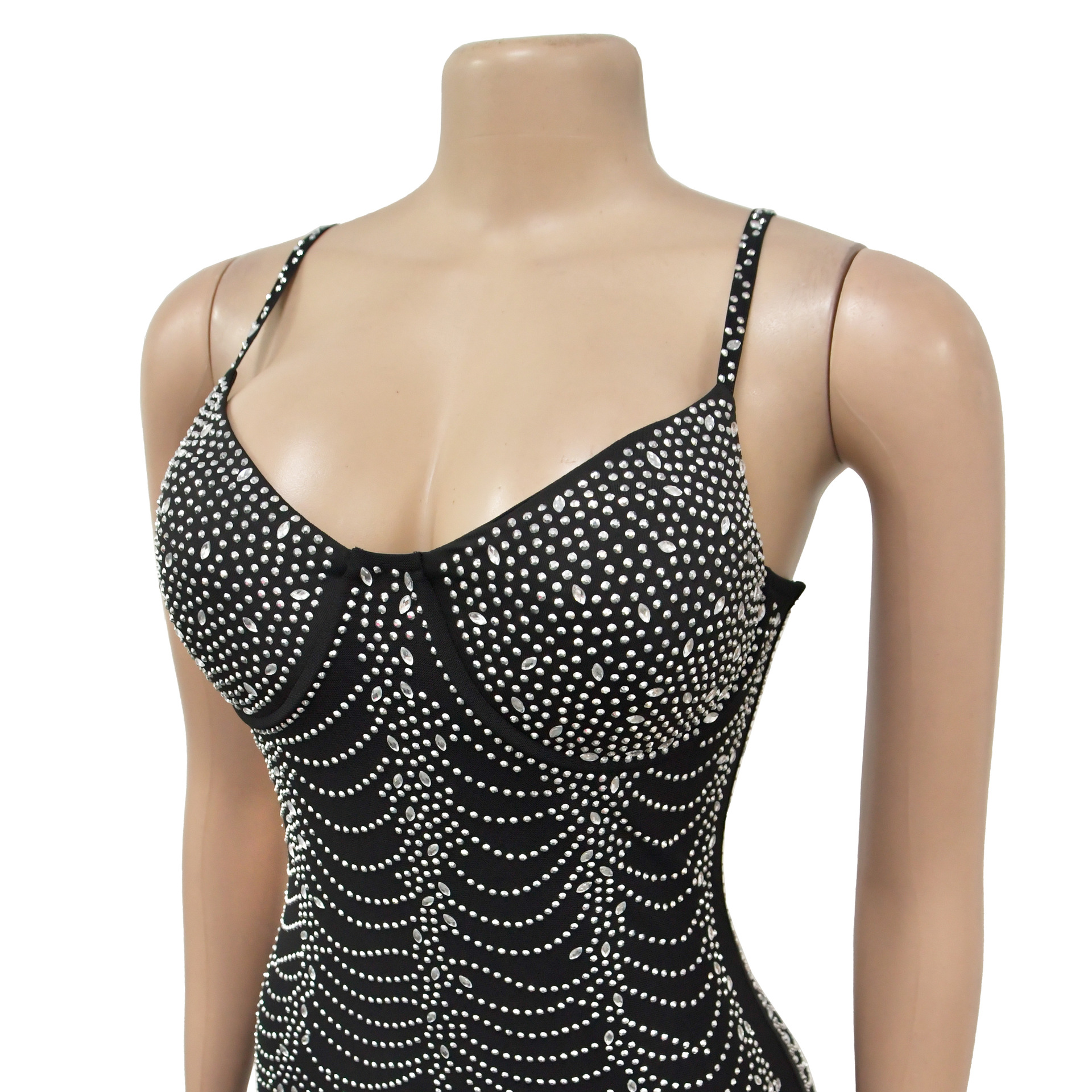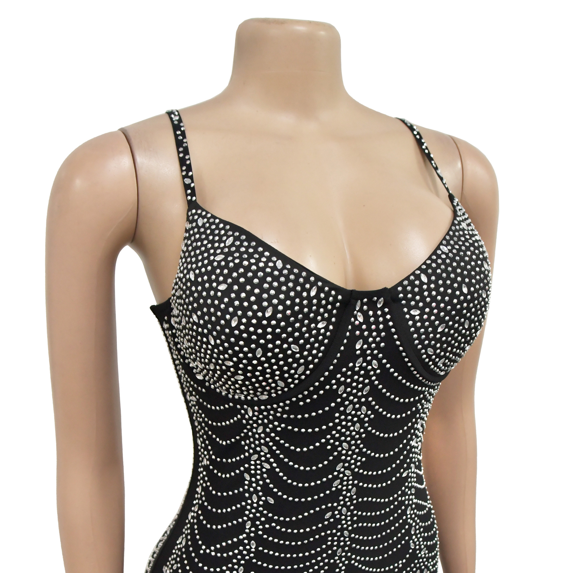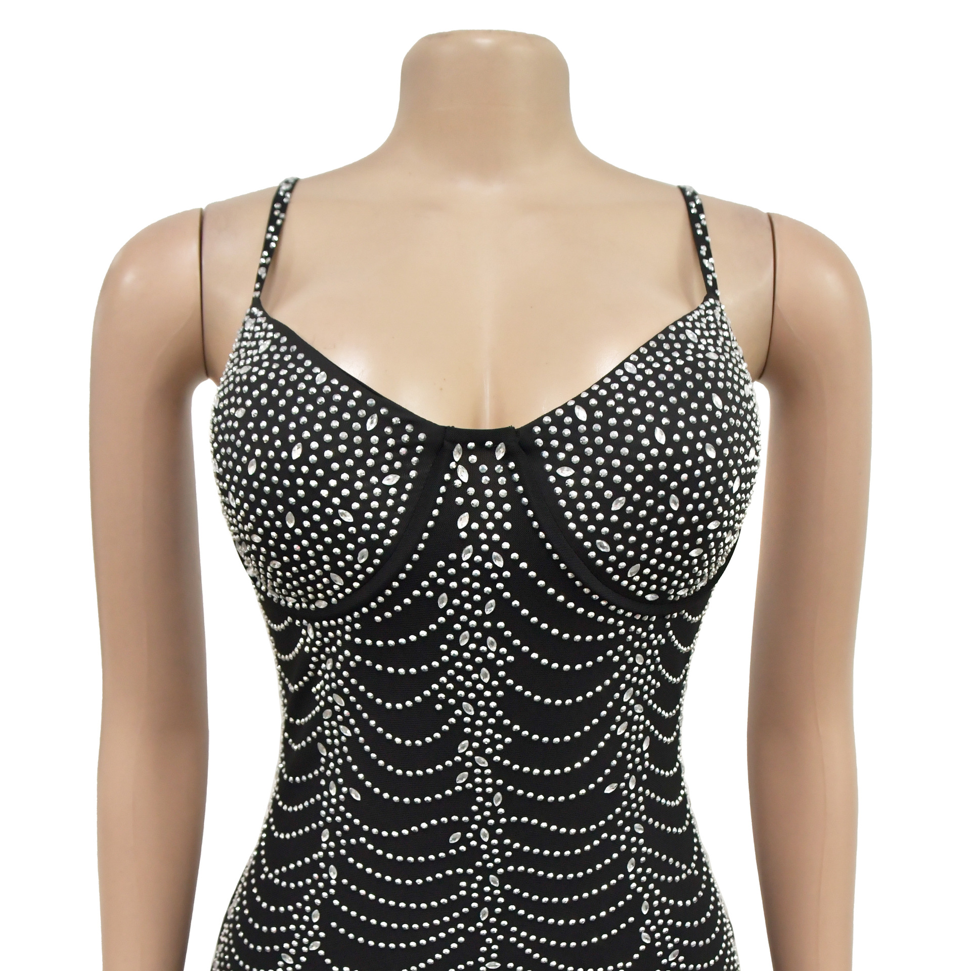 European And American Fashion Women's Pure Color Mesh Rhinestone Strap Dress